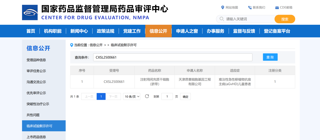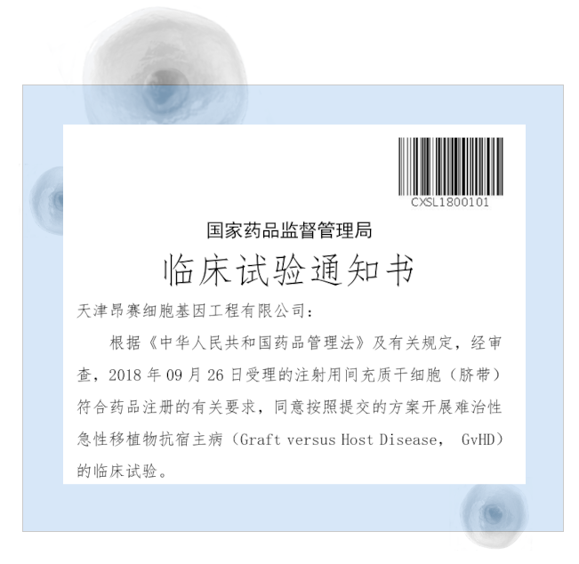 2025年11月3日, 天津昂賽細胞基因工程有限公司申報的注射用間充質干細胞(臍帶)治療難治性急性移植物抗宿主病(aGvHD)兒童患者的適應癥獲得國家藥品監(jiān)督管理局臨床試驗默示許可